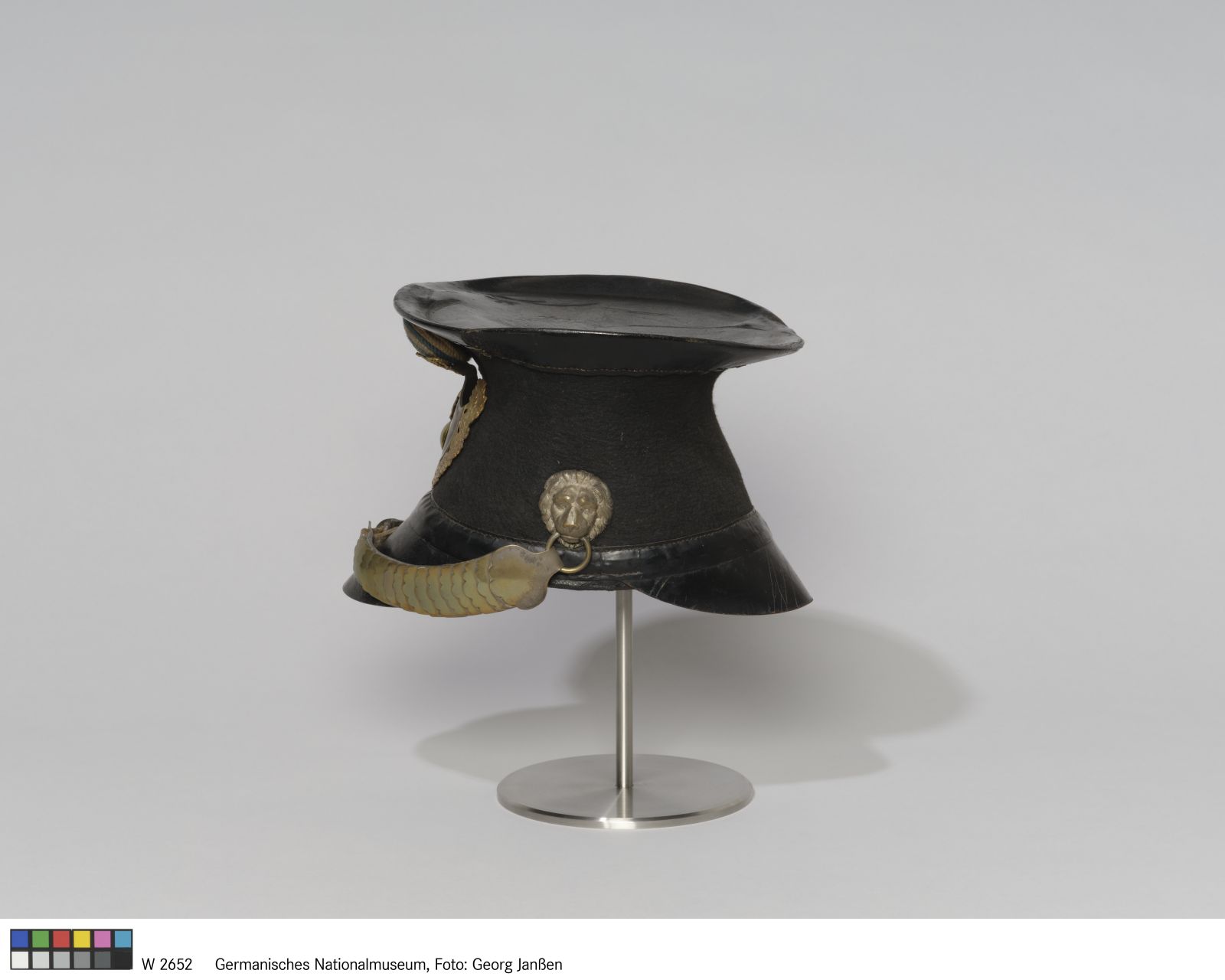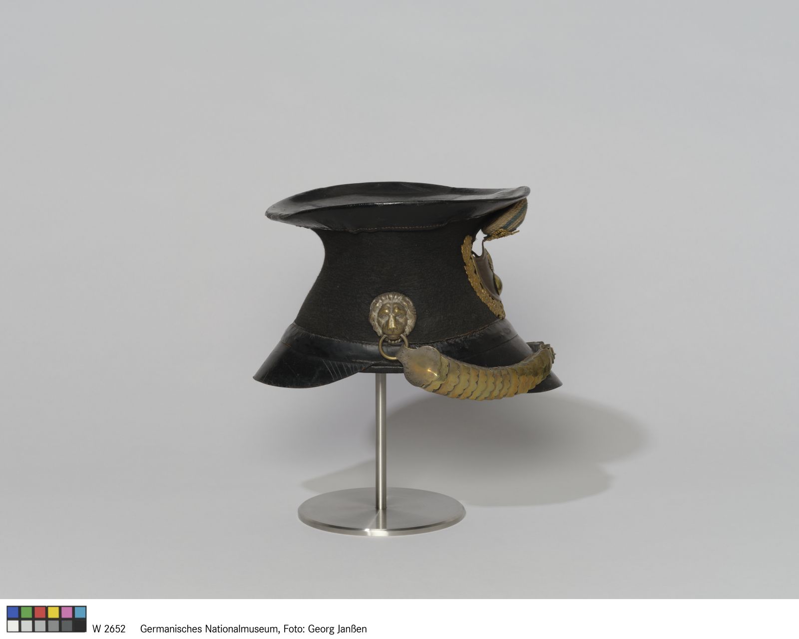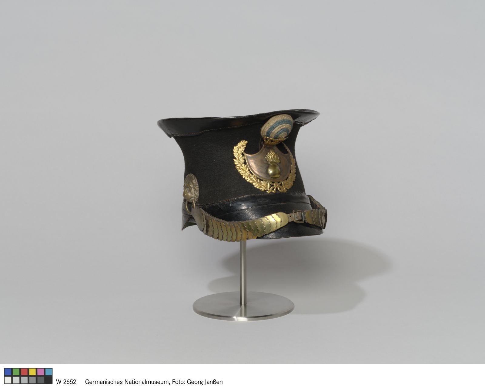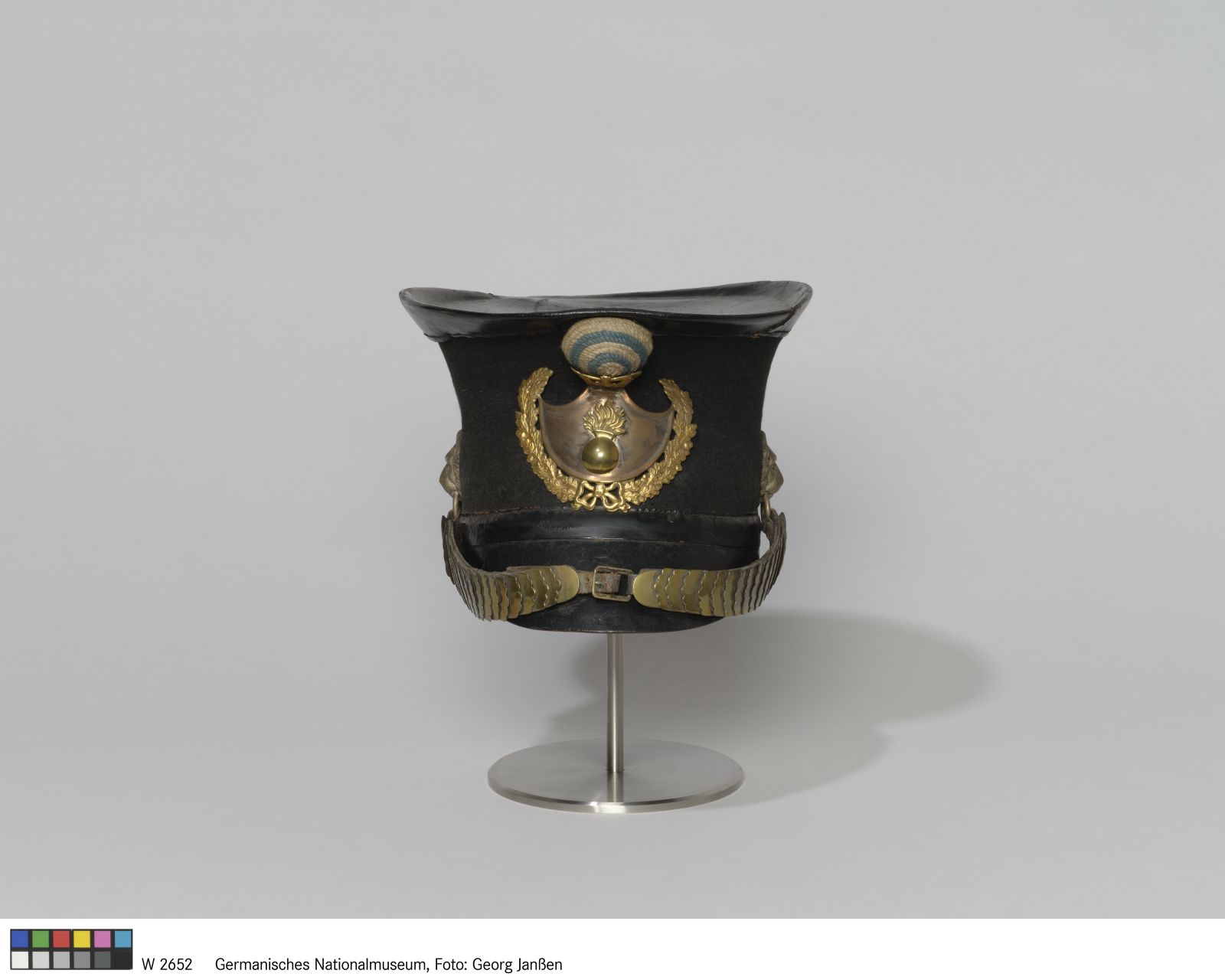 Tschako der königlich bayerischen Landwehr der Stadt Nürnberg, an der Vorderseite sitzt zwischen vergoldeten Eichenzweigen ein gekrönter Schild aus Kupfer mit einer flammenden Kugel (Granate) aus Messing (vgl. auch die Patronentasche Inv.-Nr. W2653).