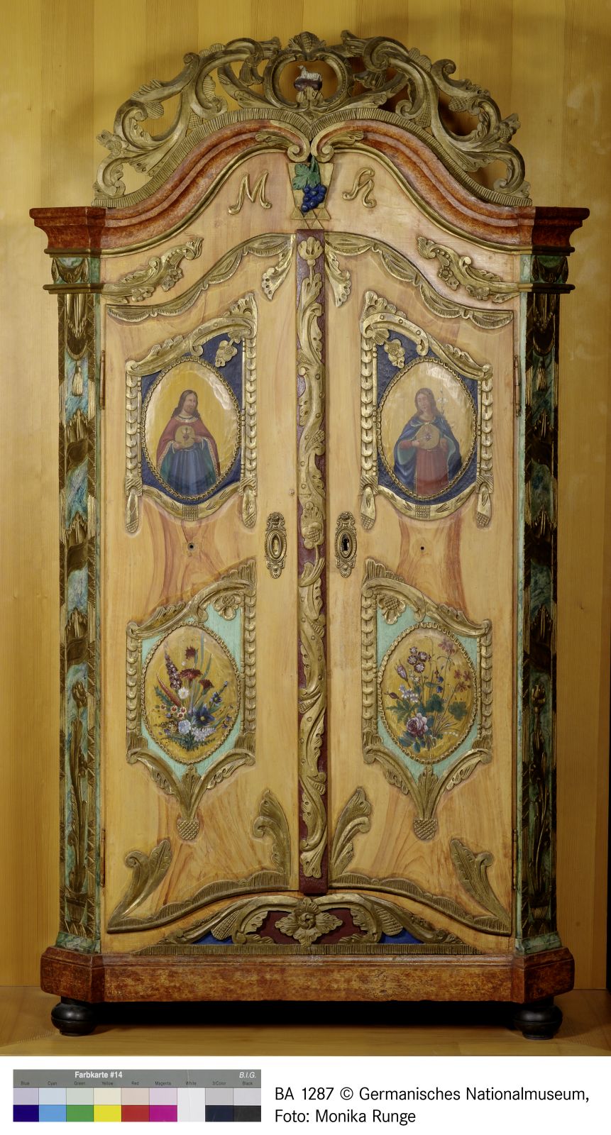 Großer Schrank, geschnitzt und teilweise bemalt. Stilmischung aus Rokokoelementen mit beginnenden Louis-Seize-Formen. Größtenteils Naturfarbe des Fichtenholzes, die Schnitzereien vergoldet und grün gefüllt. In den beiden oberen Kartuschen oben sind Jesus und Maria dargestellt. In den beiden unteren Kartuschen sind Blumensträuße zu sehen.