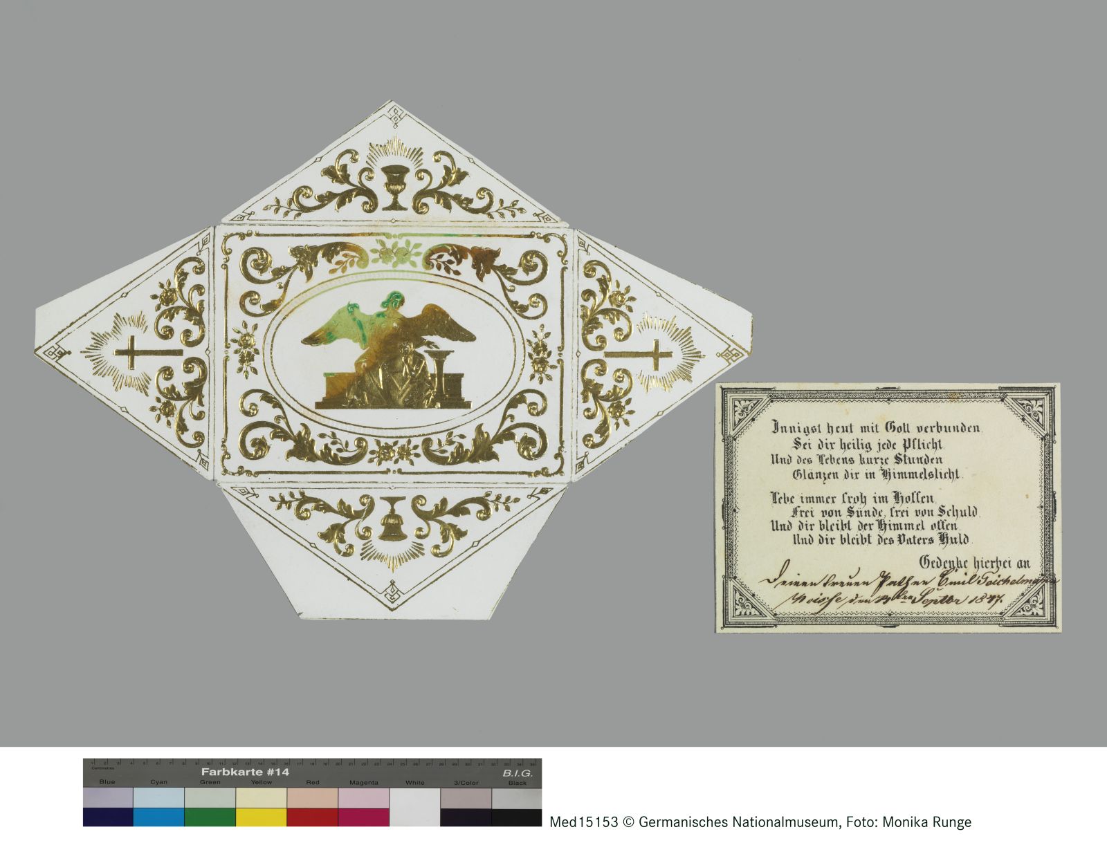 Das Etui trägt in goldenen Lettern die Aufschrift „Zum Andenken d. 14. Sept. 1847 von A. Ruppelt“. Das Patenbriefchen dessen Umschlag geprägte und vergoldete Ornamente (ein Engel, eine Taufwasserschale, ein kniendes Kind, Rankenwerk, Kelche und Kreuze) zieren, enthält ein gedrucktes Gedichtblatt mit folgendem Text: „Innigst heut‘ mit Gott verbunden / Sei dir heilig jede Pflicht. / Und des Lebens kurze Stunden / Glänzen dir in Himmelslicht. // Lebe immer froh im Hoffen, / Frei von Sünde, frei von Schuld, / Und dir bleibt der Himmel offen, / Und dir bleibt des Vaters Huld. // Gedenke hierbei an [handschriftlich:] Deinen treuen Paten Emil Teichelmann. Neiße, den 14ten September 1847“.