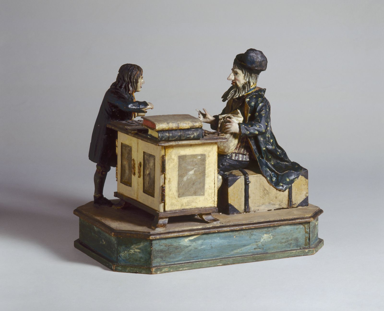 Wackelkopffigur (Der Wechsler und der Kunde) aus Lindenholz, geschnitzt und bemalt. Mit rechteckigem Sockel (Geldwechsler).