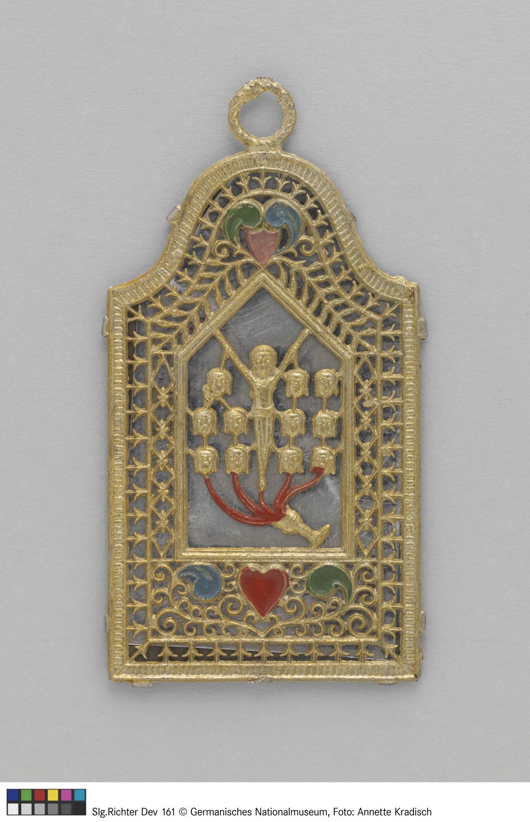 Pilger- bzw. Wallfahrtszeichen aus Walldürn. Gitterguß aus Zinn, bemalt mit Goldbronze und Ölfarben, hinterfaßt mit dünner polierter Zinnblechscheibe und Pappe. Im Zentrum des Anhängers mit dem Umriß in Form eines Giebels, ist das in Walldürn verehrte Corporale mit dem umgestürzten Kelch und den Christusköpfen zu sehen.