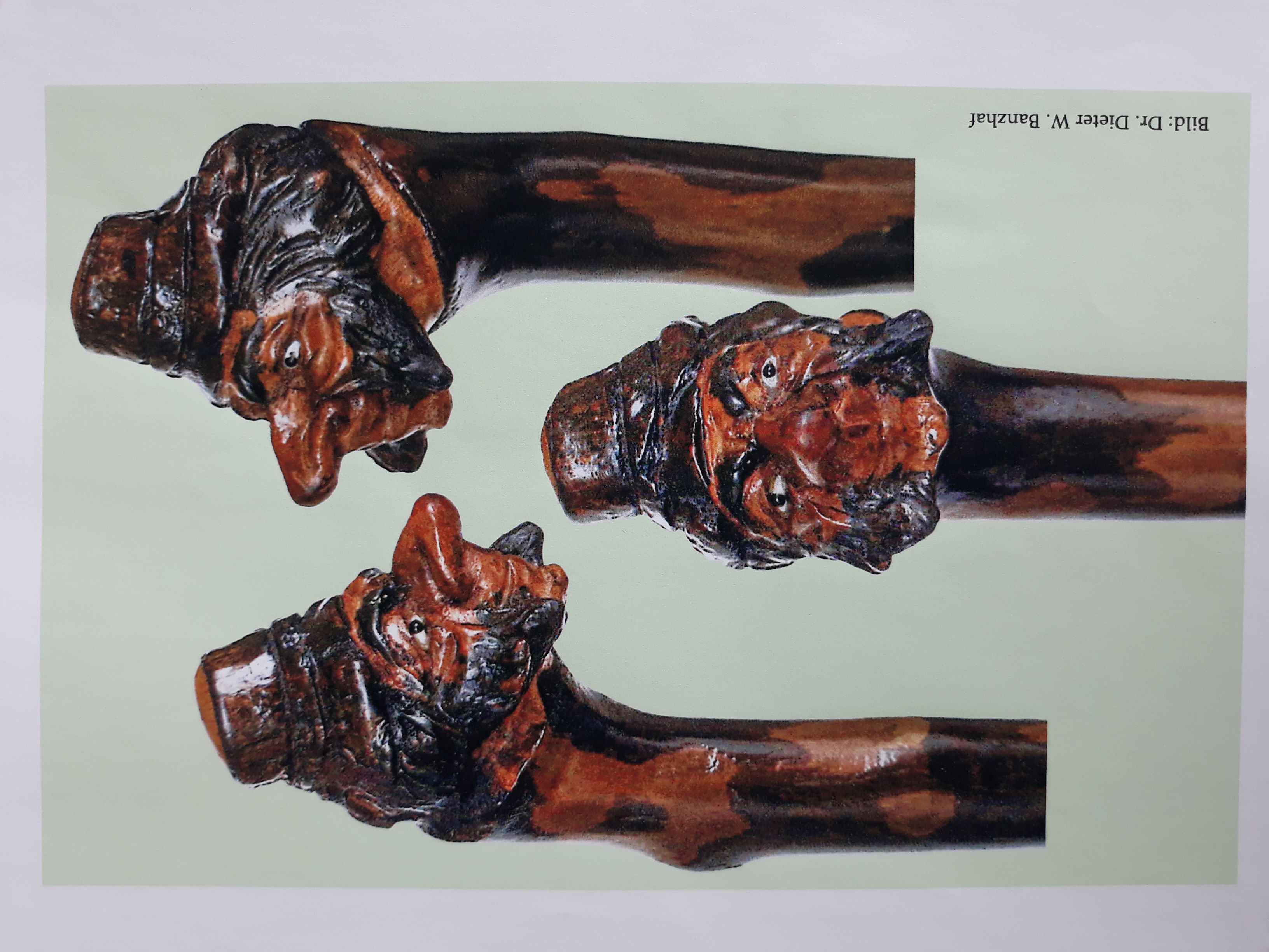 Spazierstock mit einem wohl "jüdischem" Männerkopf als Knauf. Betont lange Nase und ein Schläfenbart, auf dem Kopf ein kleiner, hoher Hut.