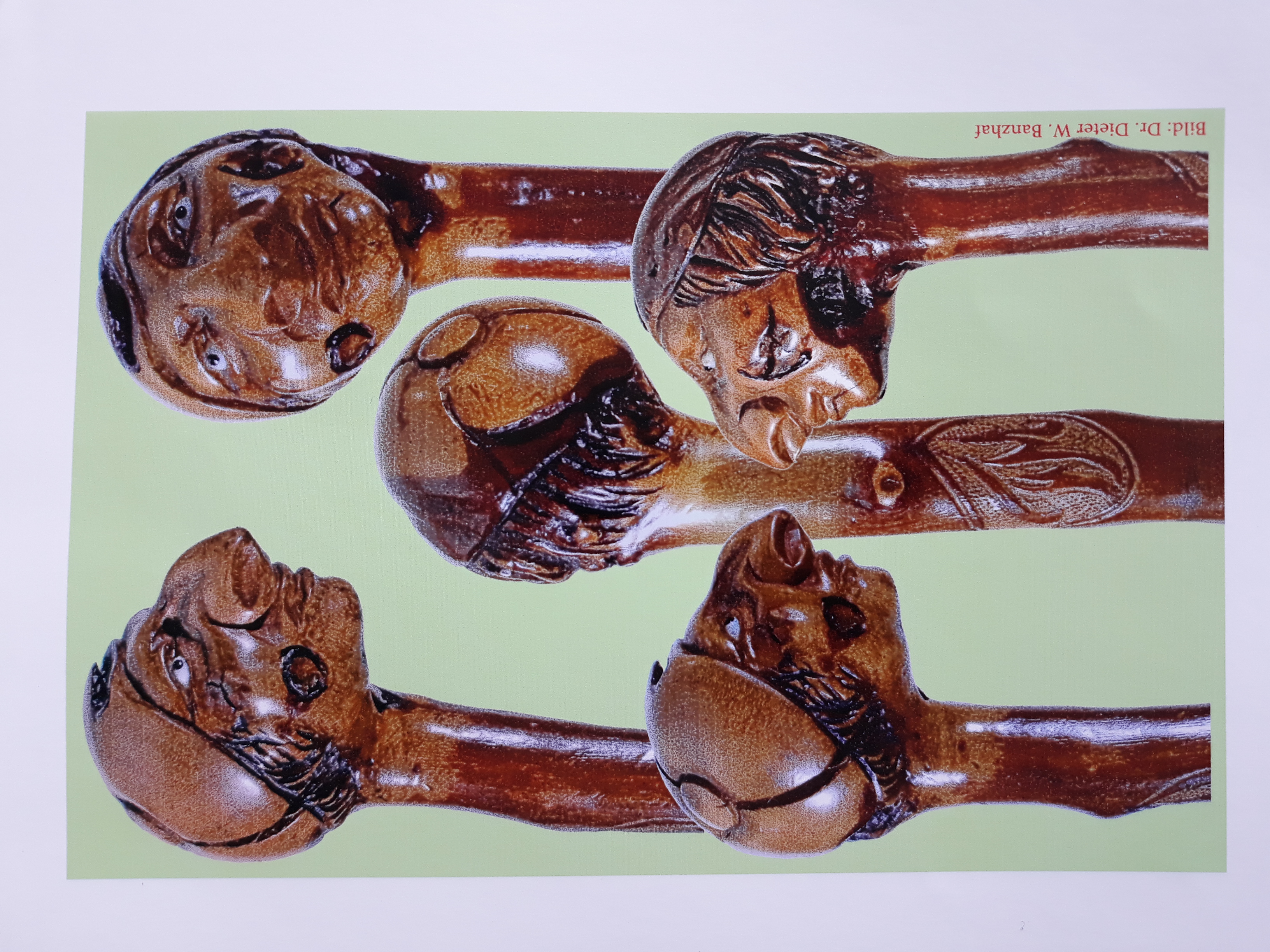 Spazierstock mit "jüdischem" Männerkopf, antisemitisch. Wulstige Lippen, Hakennase, vernarbte Backen, Glasaugen, Kopfbedeckung. Auf dem Schuss oben das Monogramm "FM" in einem wappenartigen Schild.