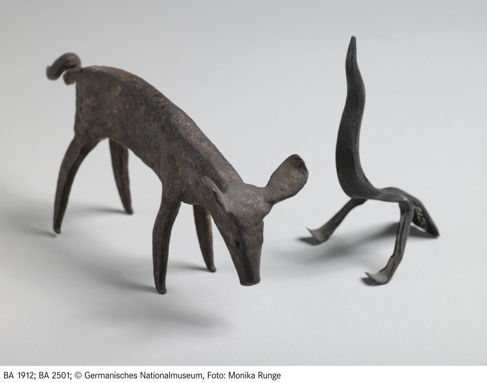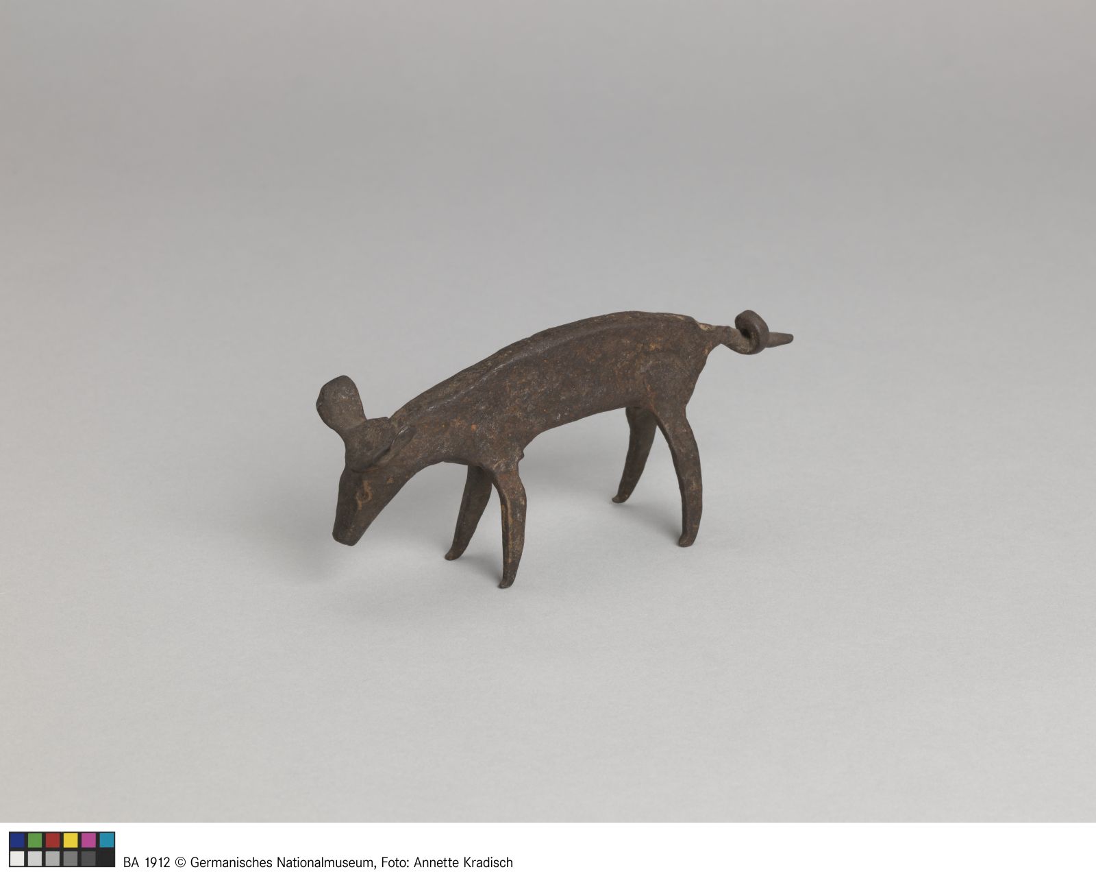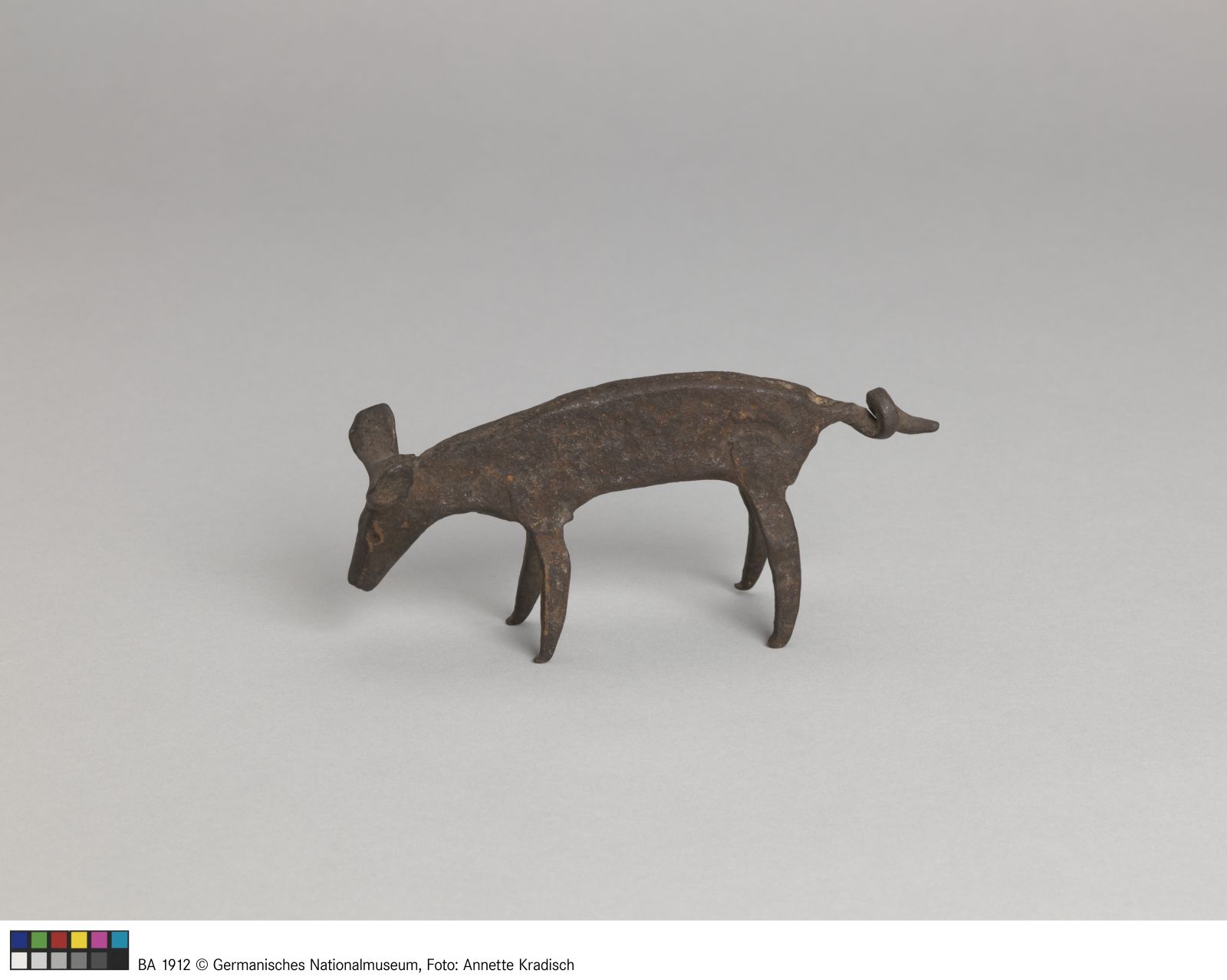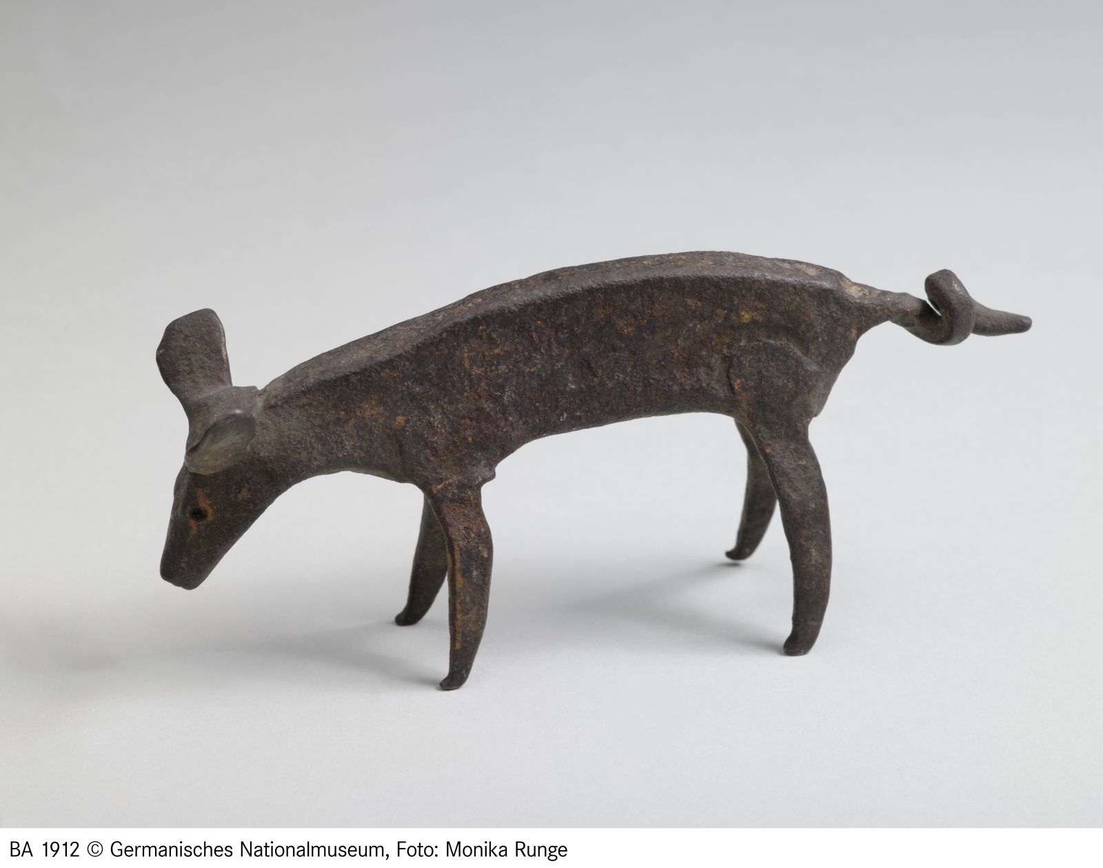 In Form eines Schweines. Aus einem Stück Flacheisen geschmiedet. Der geringelte Schwanz durch Strecken des Eisens gebildet. Die Füße und die Ohren angeschmiedet.